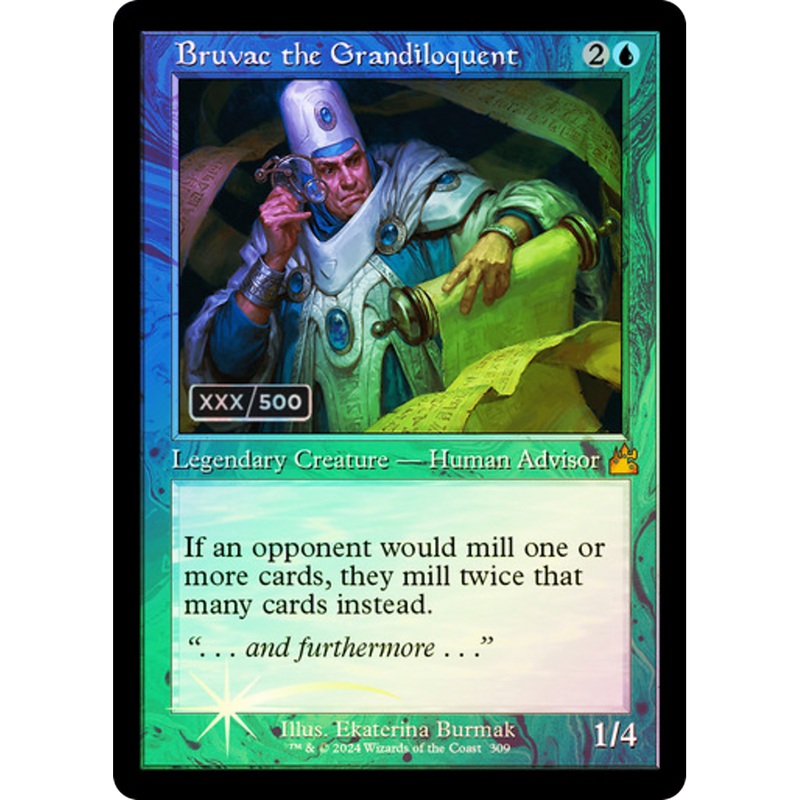 Casting Cost Card TypeLegendary Creature Human Advisor RarityMythic ArtistEkaterina Burmak Power/Toughness1/4 Legalities NOT LEGALStandardNOT LEGALFutureLEGALHistoricLEGALTimelessLEGALGladiatorNOT LEGALPioneerNOT LEGALExplorerNOT LEGALModernLEGALLegacyNOT LEGALPauperLEGALVintageNOT LEGALPennyLEGALCommanderLEGALOathbreakerNOT LEGALStandardbrawlLEGALBrawlNOT LEGALAlchemyNOT LEGALPauper CommanderLEGALDuelNOT LEGALOldschoolNOT LEGALPremodernNOT LEGALPredh If an opponent would mill one or more cards, they mill twice that many cards instead. (To mill a card, a player puts the top card of their library into their graveyard.) function toggleLegality(e) { var element = document.getElementById(“info-item-legalities”) var closed = document.querySelector(“.legalities-closed”) var open = document.querySelector(“.legalities-open”) if (element.classList.contains(‘d-none’)) { element.classList.add(“d-block”) closed.classList.add(“d-none”) open.classList.add(“d-block”) element.classList.remove(“d-none”) closed.classList.remove(“d-block”) open.classList.remove(“d-none”) } else { element.classList.add(“d-none”) closed.classList.add(“d-block”) open.classList.add(“d-none”) element.classList.remove(“d-block”) closed.classList.remove(“d-none”) open.classList.remove(“d-block”) } }
